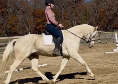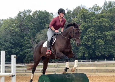 In his dressage work he is currently schooling lateral work and beginning collection. He is eager, supple, and aims to please. I would love if he stayed around for me to play in the sandbox with, I feel he has lots of potential in straight dressage. In jump tack, Levi has natural talent and wants to go to the fence. We are working on foot work to build his confidence over fences but has jumped roll tops, coops, and brush in hand without batting an eye. I feel with continued exposure and understanding of his own body, Levi will do well with a junior or amateur. He loves hacking out with his buddy and is a safe, honest guy.